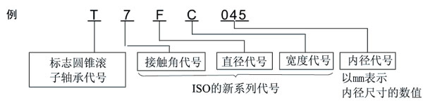 ISO355所规定的公制系列的圆锥滚子轴承中, 有不依据以往所使用的3xx尺寸系列的新尺寸。其中一部分记载于尺寸表。外圈宽度、外圈滚道的小端面直径及接触角与ISO的规定一致、内圈组件和外圈均具有*际互换性。其型号不同于以往的公制系列,构成如下。