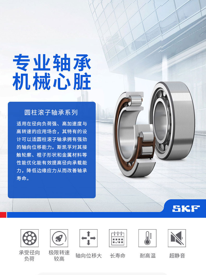 圆柱滚子与滚道为线接触轴承。负荷能力大,主要承受径向负荷。滚动体与套圈挡边摩擦小,适于高速旋转。根据套圈有无挡边,可以分有NU、NJ、NUP、N、NF等单列圆柱滚子轴承,及NNU、NN等双列圆柱滚子轴承。该轴承是内圈、外圈可分离的结构。